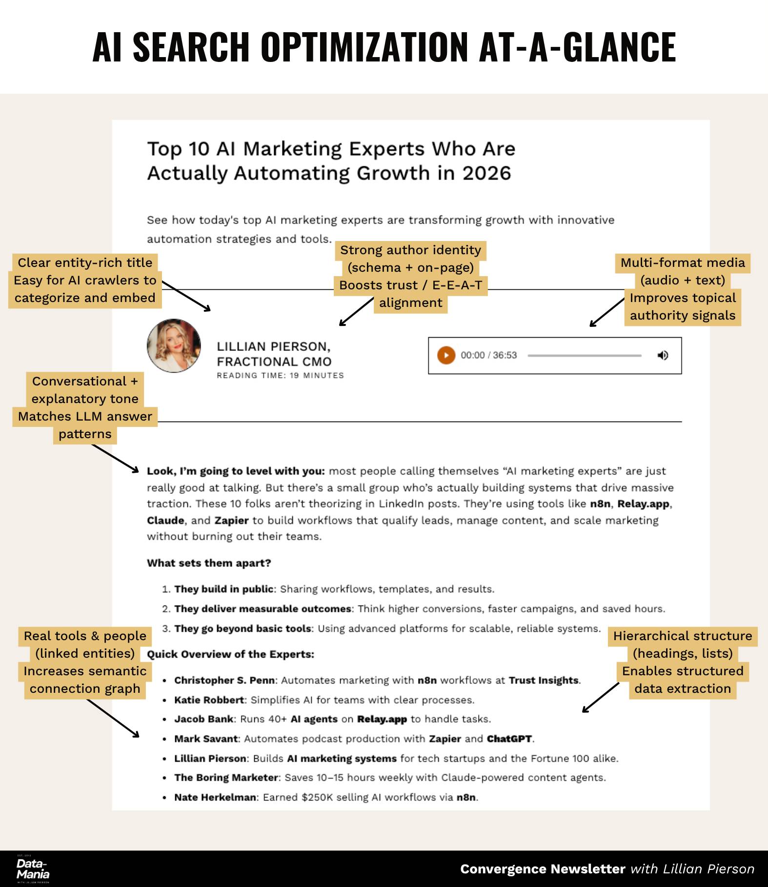 There’s something quietly costing you opportunities right now, Reader - and it’s not your product, your service, or your pricing. It’s invisibility. AI doesn’t see you. Here’s the part most founders don’t realize: The algorithms that power tools like ChatGPT, Perplexity, and Gemini are already building profiles of “credible experts” and “reputable solutions” based on what’s visible online. So while you’re polishing your pitch deck or optimizing your landing page… someone else is already showing up when AI gets asked, “Who’s building the best [insert-your-niche-here] solution right now?” Or… “Who’s the top expert on [insert-your-niche-here] right now?” And every day that passes where you and your brand don’t feed those discovery systems, your visibility score drops a little lower. That’s the bad news. The good news?AI visibility isn’t random. It’s measurable. It’s buildable. It’s fixable. And it can start compounding in your favor fast. Here’s what actually drives AI visibility (in plain English): 1️⃣ Structured Content SignalsAI search doesn’t crawl like Google - it summarizes. That means your website, LinkedIn, or public Notion docs need to include structured clarity around what you do, who you help, and what proof backs it up. Think “clean metadata + expert cues,” not “keyword stuffing.” 2️⃣ Author AuthorityLarge language models weigh who information comes from. So, your personal name - not just your company - needs to show up consistently across public data. Your founder profile is your domain authority now. Your founder profile is your domain authority now. 3️⃣ Entity LinkingThis is where AI decides how to “connect the dots.” If your name and company appear alongside related entities (for example, AI ethics, predictive analytics, B2B SaaS), then you become easier for AI to recommend in that context. Even one or two well-placed signals can shift how you appear in semantic search - and that visibility compounds over time. Visibility today involves teaching AI how to recognize your expertise. If you take nothing else from this email, remember this: And you don’t need a marketing team, new SaaS tools, or weeks of work to start. I’ve distilled everything I’ve tested into a simple, founder-friendly framework that helps you get visible in AI search in days, not months. It’s dropping in early Nov - but only for waitlist members at first. Here’s what you’ll get for being early: ▶️ Founding-Member Pricing (lowest it’ll ever be - under $50) 👉 Get on the list now before these beta perks disappear Lillian Pierson Growth Partner & Fractional CMO P.S. In the next installment, I’ll show you why SEO isn’t enough anymore - and how to future-proof your discoverability as AI search keeps evolving. |