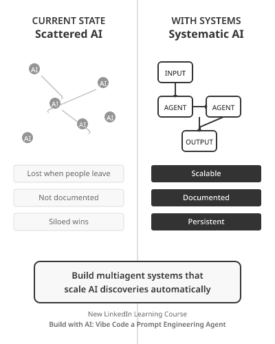 Hey Reader- You ever feel like your team is sitting on an AI goldmine... but somehow can't scale it? Here's what I'm seeing everywhere: Your engineer discovers a ChatGPT prompt that cuts code review time by 70%. Your marketer finds a Claude workflow that writes killer email sequences in minutes. Your sales rep figures out an AI trick that doubles reply rates. But then what happens? That engineer leaves. The marketer gets promoted. The sales rep forgets to document anything. And just like that? All those AI productivity wins vanish. Meanwhile, your competitors who figure out how to systematize this stuff? They're building compounding advantages while you're back to square one. Here's the thing nobody talks about: The problem isn't that your team doesn't know how to use AI. The problem is that you're treating AI adoption like a side hobby instead of a system. And that's exactly what I solve in my new LinkedIn Learning course: "Build with AI: Vibe Code a Prompt Engineering Agent to Drive LLM Adoption." This isn't another "ChatGPT 101" course. This is a hands-on blueprint for building a multiagent system that captures your team's best AI discoveries and scales them automatically across departments. You'll learn to build task-specific agents with dynamic variable substitution, structured input interfaces, and file management systems that track outputs. Think of it as the AI infrastructure that turns your scattered wins into systematic advantages. Ready to stop watching your best AI discoveries slip away? It's free for all LinkedIn Premium users. Because here's what I know: Your team is already finding AI breakthroughs. You just need the system to capture and scale them. Talk soon, Lillian Pierson Growth Partner & Fractional CMO P.S. Hit reply if this resonates. I read every response and love hearing about the AI wins (and fails) you're seeing in your organization. |